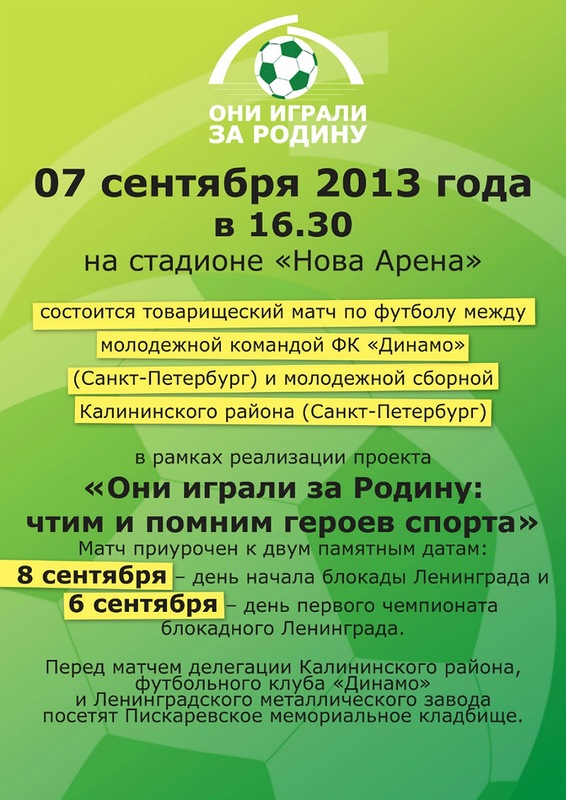 ПМЦ «Калининский» приглашает всех на футбольный матч, посвященный памяти спортсменов-героев. Матч пройдет на стадионе «Нова Арена» по адресу: Муринский парк, пересечение Северного и Гражданского проспектов (напротив дома 65 по Северному пр.)