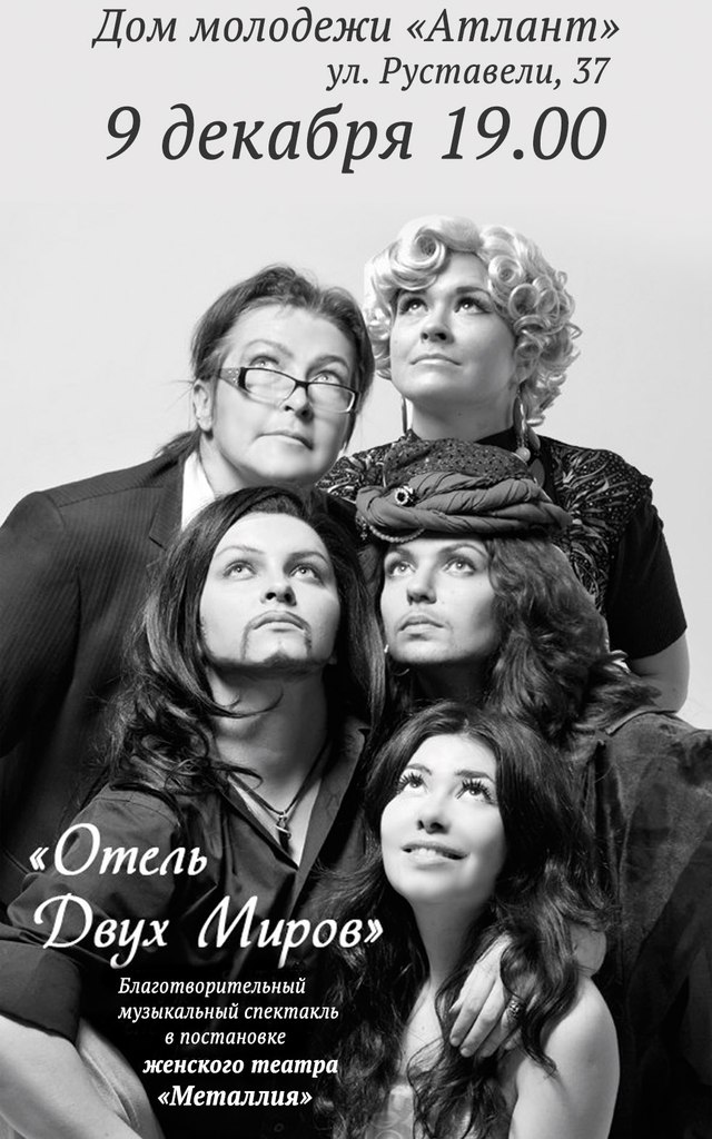 Приглашаем Вас на благотворительный музыкальный спектакль «Отель Двух Миров» в постановке женского театра «Металлия». Мюзикл состоится 9 декабря в 19.00 в Доме молодежи «Атлант».