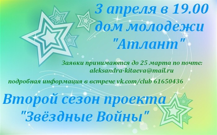 «Звездные войны», проект Дома молодежи «Атлант», — это возможность проявить себя в новом амплуа — пародиста. Вы можете выбрать подходящую номинацию в зависимости от манеры пародии (живой вокал, пародия под плюс и пародию на известную личность).