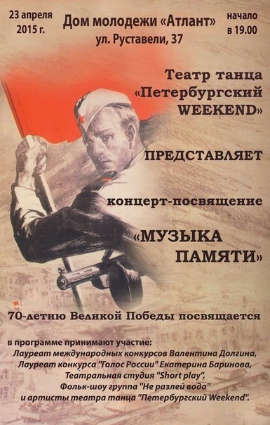 В программе «Музыка Памяти» прозвучат не только известные любимые мелодии военных лет в исполнении профессиональных артистов, но и песни послевоенного времени при участии юных воспитанников молодежного театра-студии эстрадного танца «Петербургский Weekend».