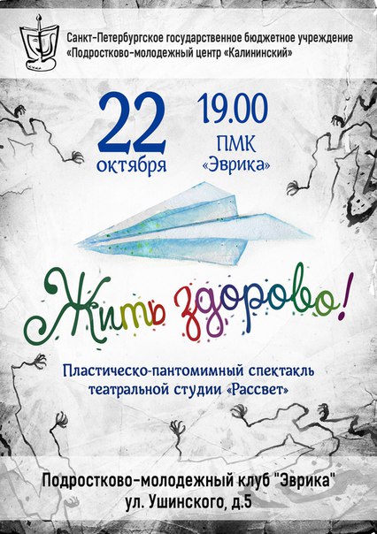 Подростково-молодежный клуб «Эврика» (ул. Ушинского, д.5) приглашает на премьерный показ молодежного спектакля «Жить здорово».