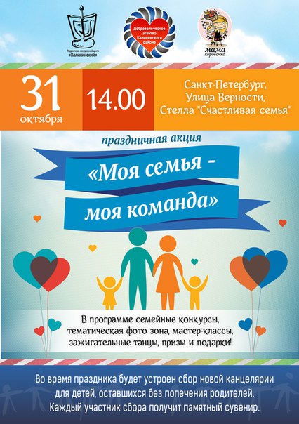 Добровольческое агентство Калининского района СПб ГБУ ПМЦ «Калининский» приглашает всех на праздничную уличную акцию «Моя семья — моя команда», которая пройдет 31 октября в 14.00 по адресу: ул. Верности, д.4, у стелы «Счастливая семья».