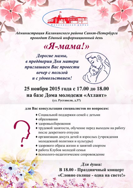 Также в этот день Администрация Калининского района проводит Единый информационный день «Я-мама!». С 17.00 до 18.00 в Доме молодежи «Атлант» для Вас будут открыты консультационные пункты.