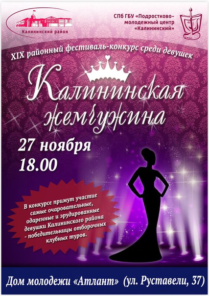 27 ноября в 18.00 в концертном зале Дома молодежи «Атлант» (ул.Руставели, д.37), состоится XIX Фестиваль-конкурс «Калининская жемчужина — 2015».