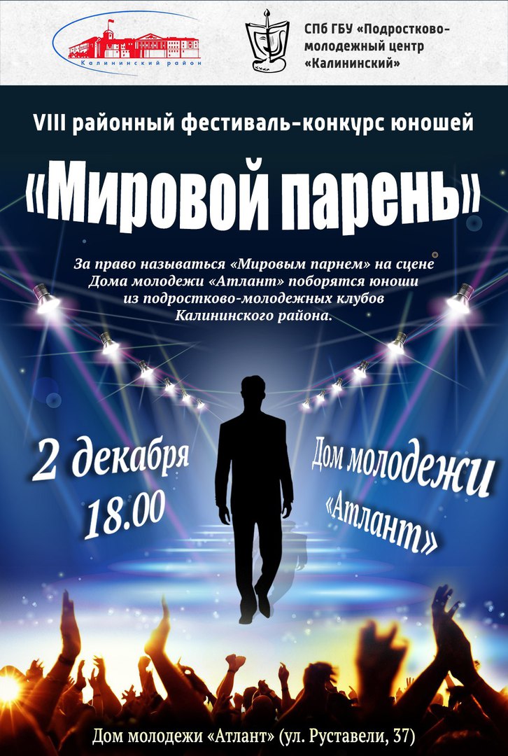 2 декабря на сцене дома молодежи «Атлант» (ул. Руставели, д.37) состоится финал VIII районного фестиваля-конкурса юношей «Мировой парень»
