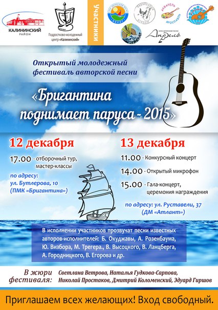 А 13 декабря в 11.00 приглашаем всех любителей авторской песни на конкурсный концерт фестиваля в Дом молодежи «Атлант» (ул. Руставели, д.37). В исполнении участников прозвучат песни Б.Окуджавы, А.Розенбаума, Ю.Визбора, М.Трегера., В.Высоцкого, В.Ланцберга, А.Городницкого, В.Егорова и др. В 14 часов во время подведения итогов все желающие могут выйти на сцену Дома молодежи с творческим выступлением в формате открытого микрофона.