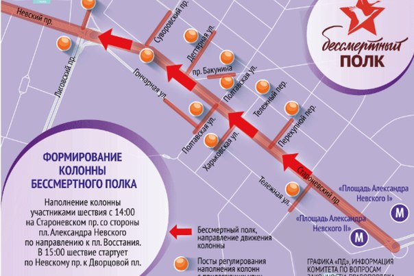 В этом году сбор Бессмертного полка будет проходить между пл. Восстания и пл. Александра Невского на Староневском проспекте. Это позволит избежать слишком плотного скопления людей. Как сообщили в Комитете по вопросам законности, правопорядка и безопасности, для регулирования людских потоков планируется использовать возможности метрополитена. Основная станция метро, на которую будут прибывать участники шествия, — «Площадь Александра Невского». Планируется, что в шествии Бессмертного полка примут участие представители более 30 национально-культурных объединений, автономий и землячеств Петербурга: они пройдут в традиционных национальных костюмах в знак памяти о том, что Победа была достигнута объединенными усилиями всей нашей многонациональной страны. На время проведения массовой акции в центре города усилят меры по обеспечению безопасности. Для этого будут привлечены дополнительные наряды полиции, усиленные более чем 1 тыс. народных дружинников.