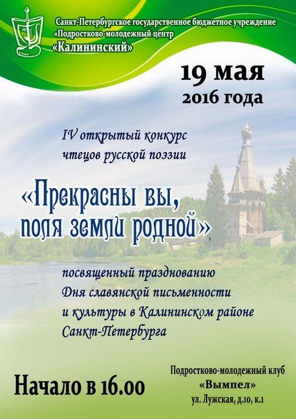 19 мая в подростково-молодежном клубе «Вымпел» пройдет IV открытый конкурс чтецов русской поэзии «Прекрасны вы, поля земли родной», приуроченный к празднованию Дня славянской письменности и культуры в Санкт-Петербурге.