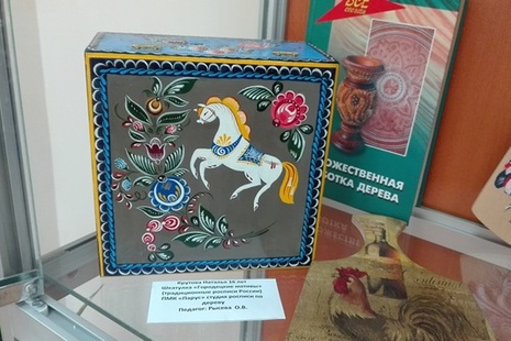 На выставке представлены расписные шкатулки и декоративные разделочные доски, традиционные русские вышивки, резные фигурки из дерева, выполненные ребятами из студии традиционной народной росписи, под руководством Ольги Владимировны Рысевой.