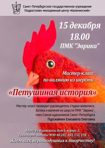 15 декабря в 18.00 ПМК «Эврика» приглашает всех желающих на на мастер-класс в технике валяния из шерсти «Петушиная история»