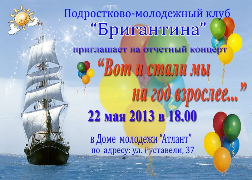 «Вот и стали мы на год взрослее…» Под таким названием 22 мая в 18.00 на сцене Дома молодежи «Атлант» пройдет отчетный концерт ПМК «Бригантина».