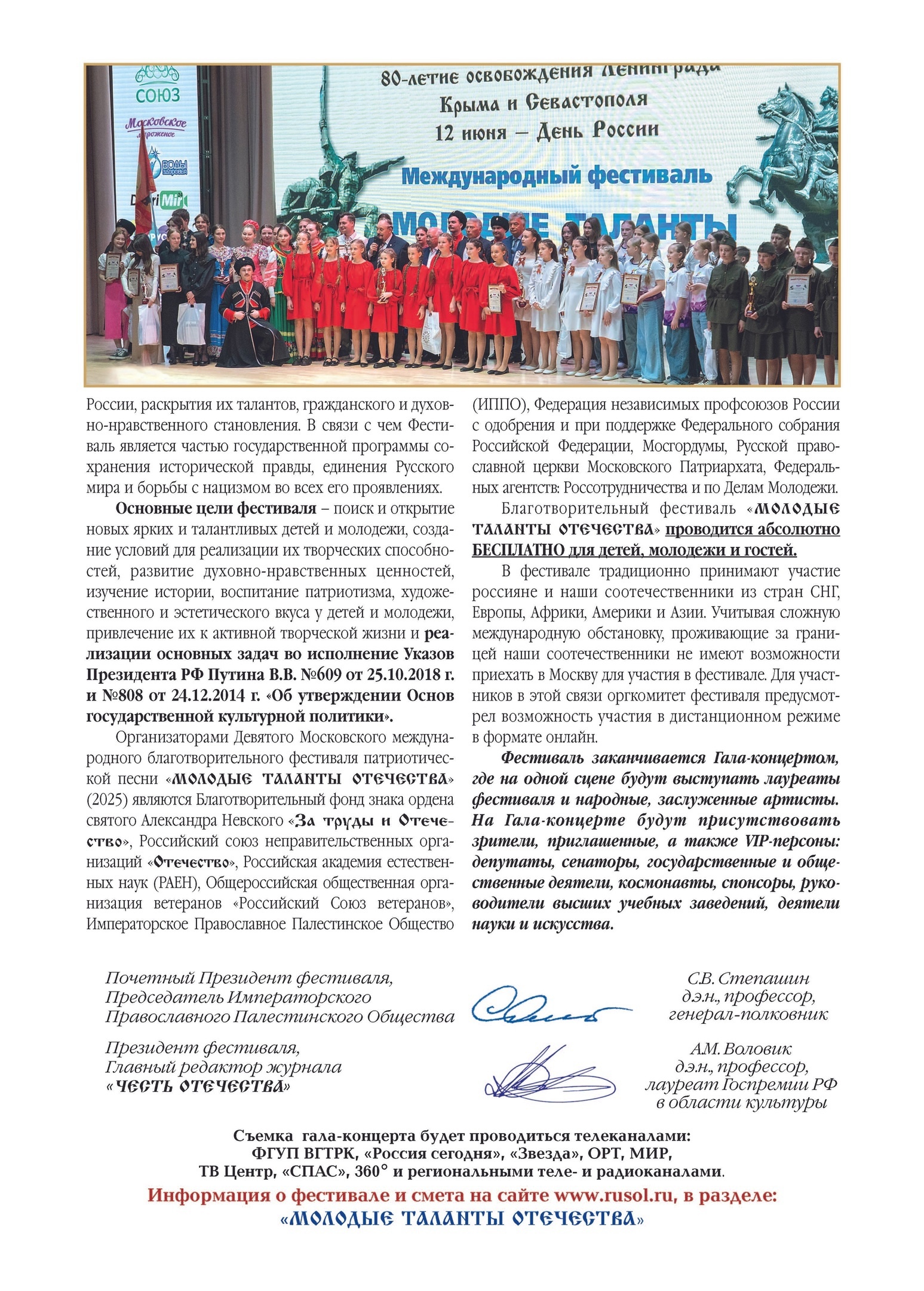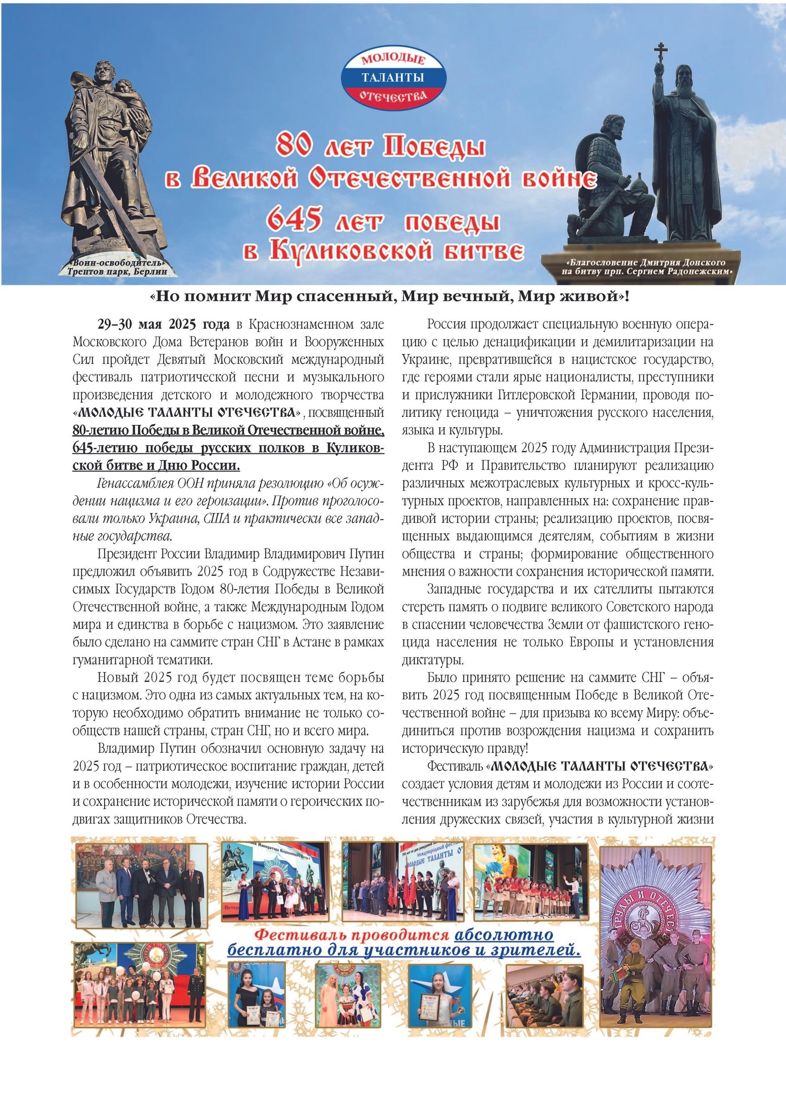 29–30 мая 2025 года в Москве пройдёт Девятый Московский международный фестиваль патриотической песни и музыкального произведения детского и молодёжного творчества «Молодые таланты Отечества»